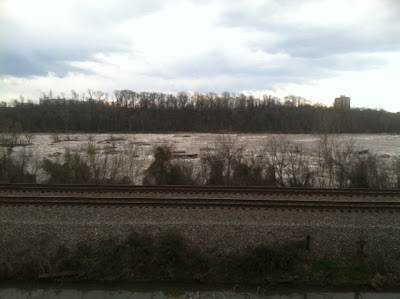 Looking upriver, from the bridge on the south side of Belle Isle. The rocks where we like to play are all under water! |